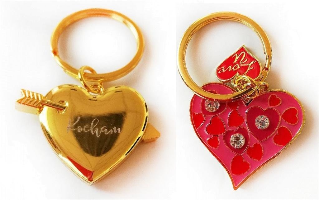 "Metalowy brelok w kształcie serca przebitego strzałą, ze specjalnym grawerem Kocham. Brelok w kolorze złota. Doskonale sprawdzi się jako upominek na walentynki, jak również na inne okazje.Idealny dodatek do kluczy, torebki, plecaka.""Metalowy brelok w kształcie serca ze specjalnym grawerem...