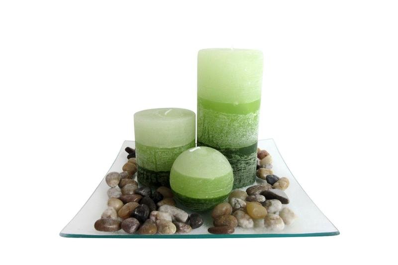 Dárkový set 3 svíčky s vůní "zelený čaj" na skleněném podnosu s kameny