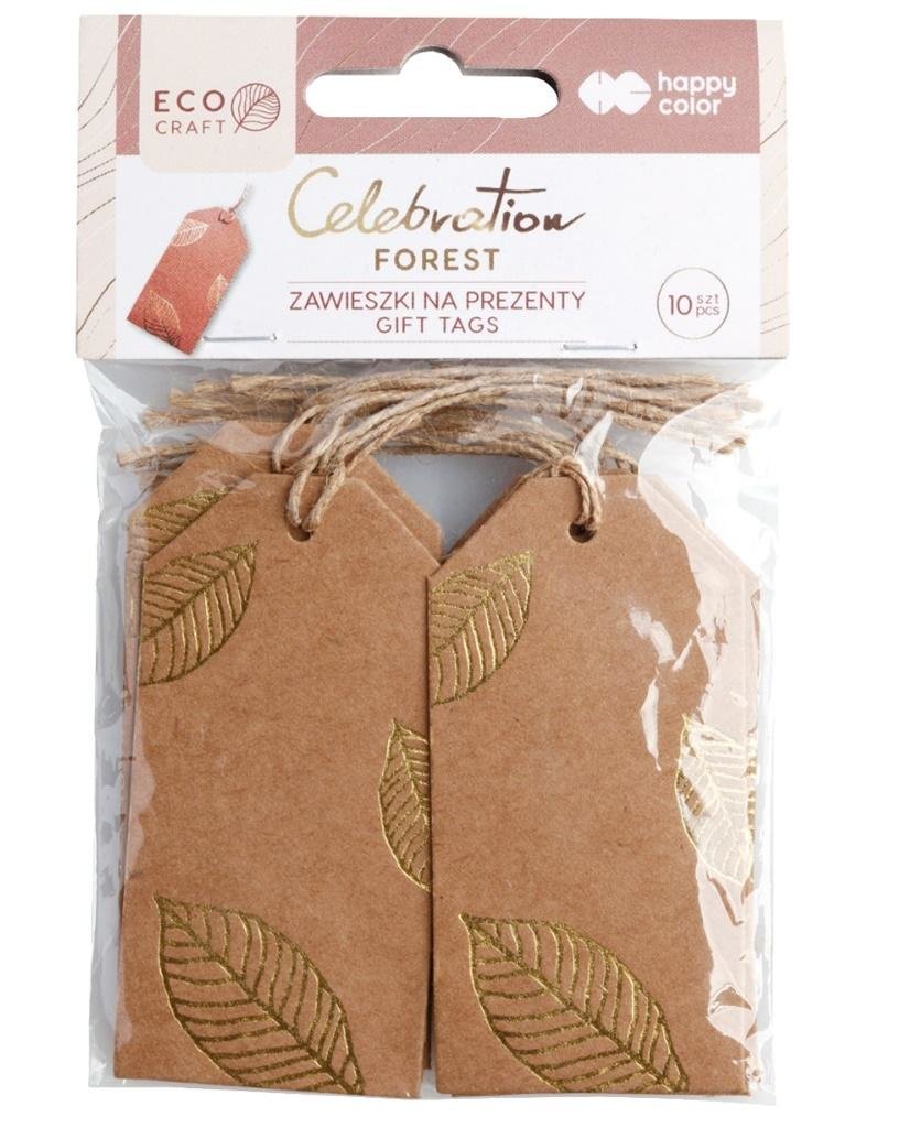 Eleganckie zawieszki na prezenty z brązowego papieru kraftowego z wytłoczonymi złotymi liśćmi. Możliwosć dopisywania dedykacji. Każda zawieszka posiada sznureczek w kolotrze naturalnym. Kształt - prostokątny Wymiar 8 x 4 cm Sznureczek - naturalny Ilość w opakowaniu - 10 sztuk