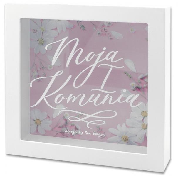 Pierwsza Komunia Święta to niezwykła chwila...Niech ta skarbonka będzie pamiątką, a uzbierany w niej fundusz zostanie wydany na coś naprawdę wyjątkowego!Skarbonka jest wykonana z MDfu wraz ze szklaną szybką oraz ozdobnym napisem.Zapakowana w estetyczne, kolorowe pudełko. Format: 18 x 18 cm.