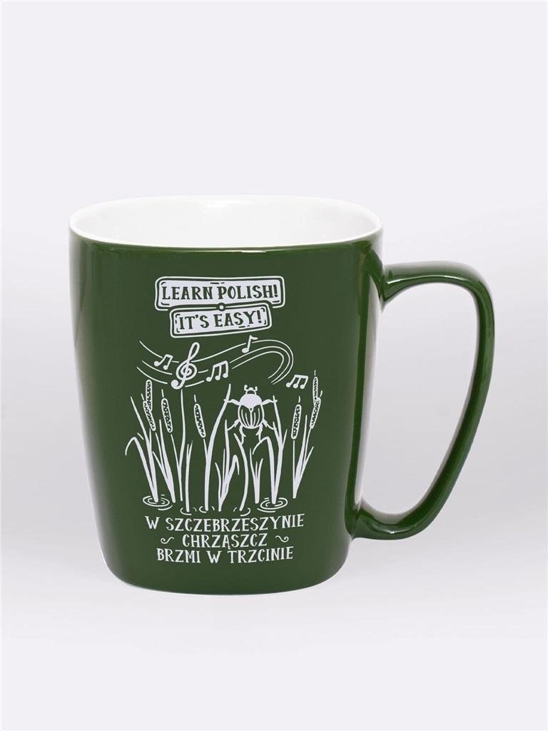 Zielony kubek z chrząszczem radośnie brzmiącym w trzcinie to doskonały wybór na prezent dla obcokrajowca lub pamiątka z Polski.