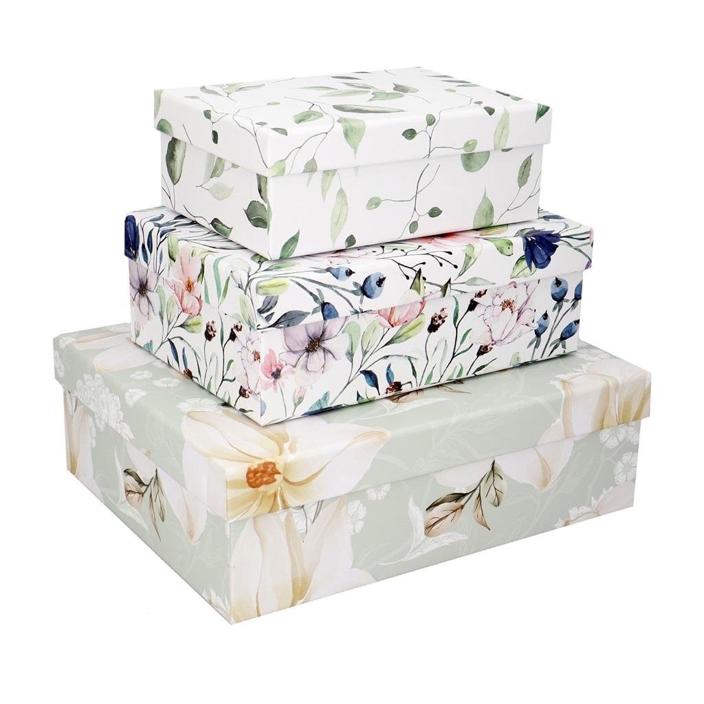 Zestaw 3 papierowych pudełek prezentowych w różnych rozmiarach: 16,5x11,5x6 cm, 20x14x7 cm, 25x20x8 cm z gustowną kwiatową grafiką. prečítať celé