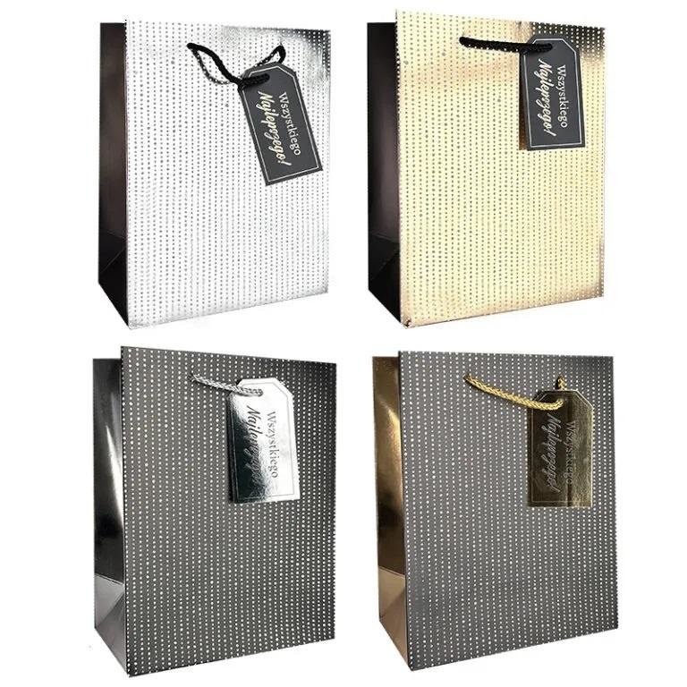 Torby prezentowe bogato ozdobione srebrną lub złotą foliąGruby papier o dużej sztywności gramatura 210 g/m2Wzór wysyłany losowo. prečítať celé