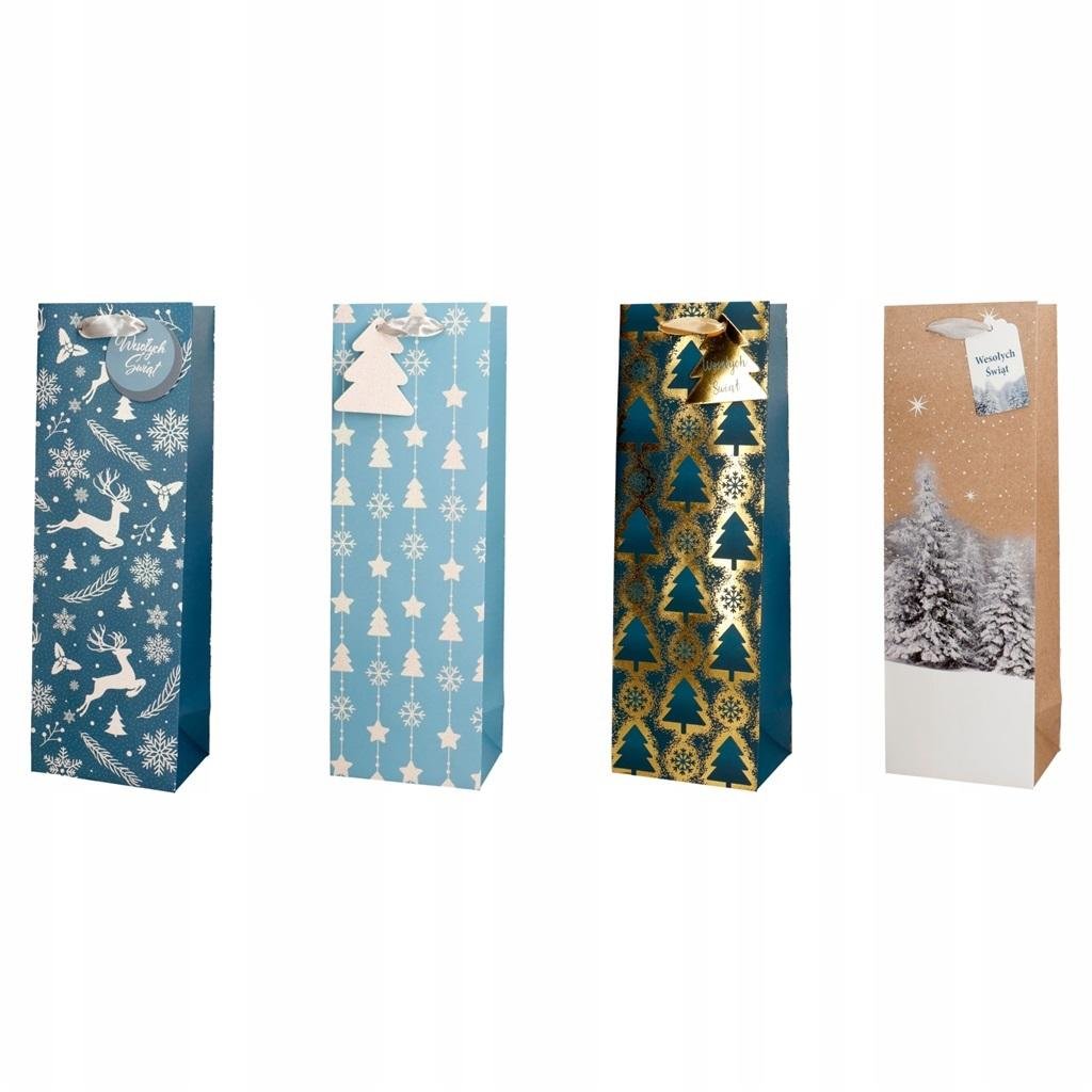 Torba prezentowa na butelkę 4 sztuki zestaw eleganckich toreb prezentowych wykonane z wysokiej jakości papieru o gramaturze 210 gsm o satynowym matowym wykończeniu satynowa rączka piękny świąteczny nadruk dodatkowo zdobione brokatem lub hot-stampingiem bardzo eleganckie...