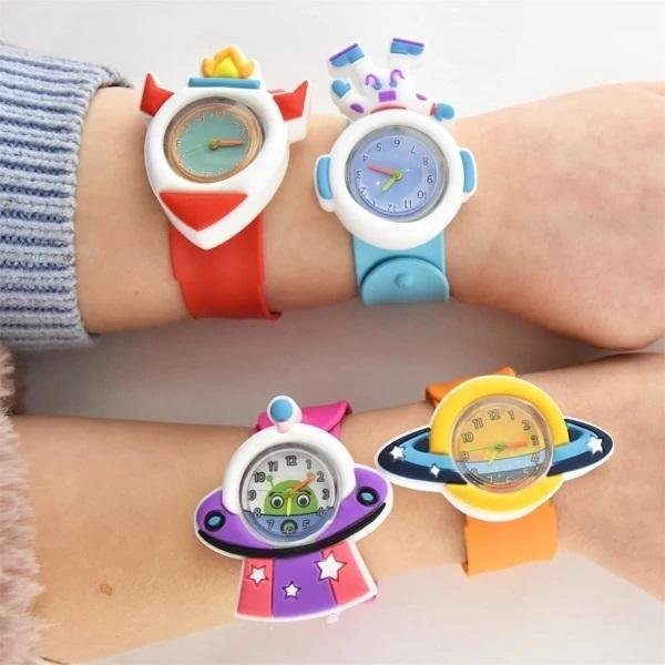 Niezwykle kolorowy oraz bardzo wygodny zagarek dla malucha. Nauka zegara to niezwykle ważny element dzieciństwa. Kosmiczny zegarek doskonale sprawdzi się w roli gadżetu, materiału dydaktycznego oraz ulubionej zabawy w SLAP opaskę. Dzieci , nawet te najmłodsze chętnie same klikają paskiem bez pomocy osoby dorosłej.