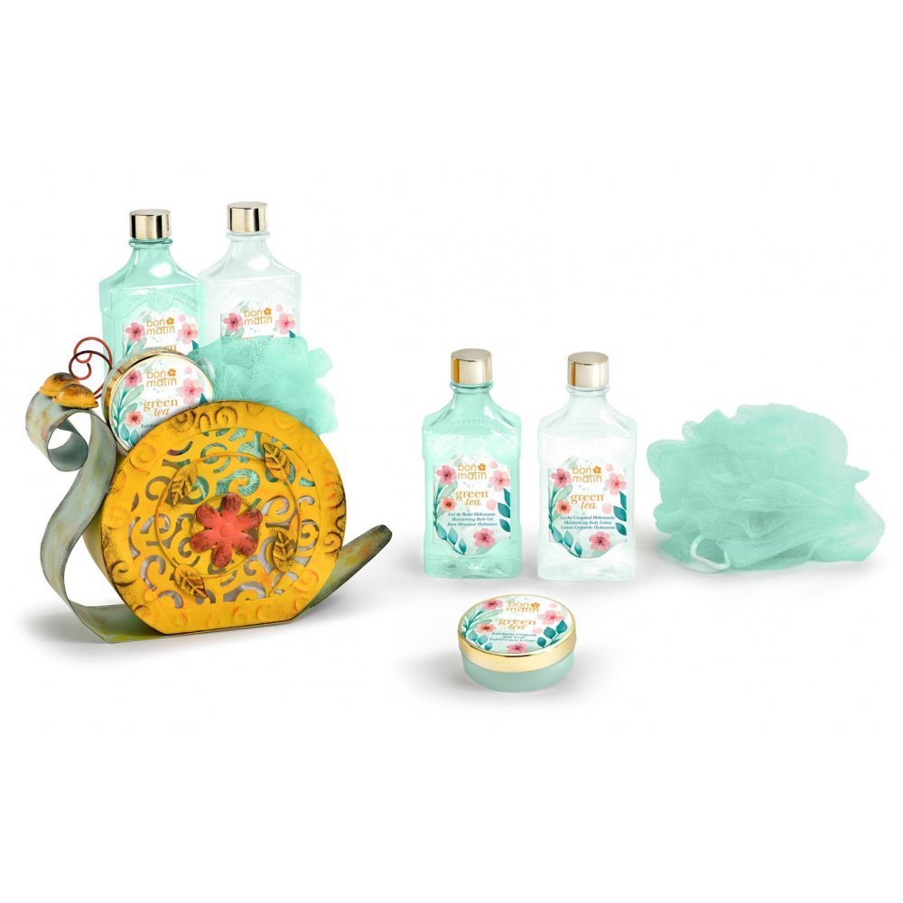 Dárková sada značky Bon Matin Green tea s dekoračním předmětem patinovaného plechového šneka obsahuje: 200 ml hydratační sprchový gel, 200 ml hydratační tělové mléko, 50 ml tělový peeling, vše s vůní zeleného čaje, houbička na mytí prečítať celé