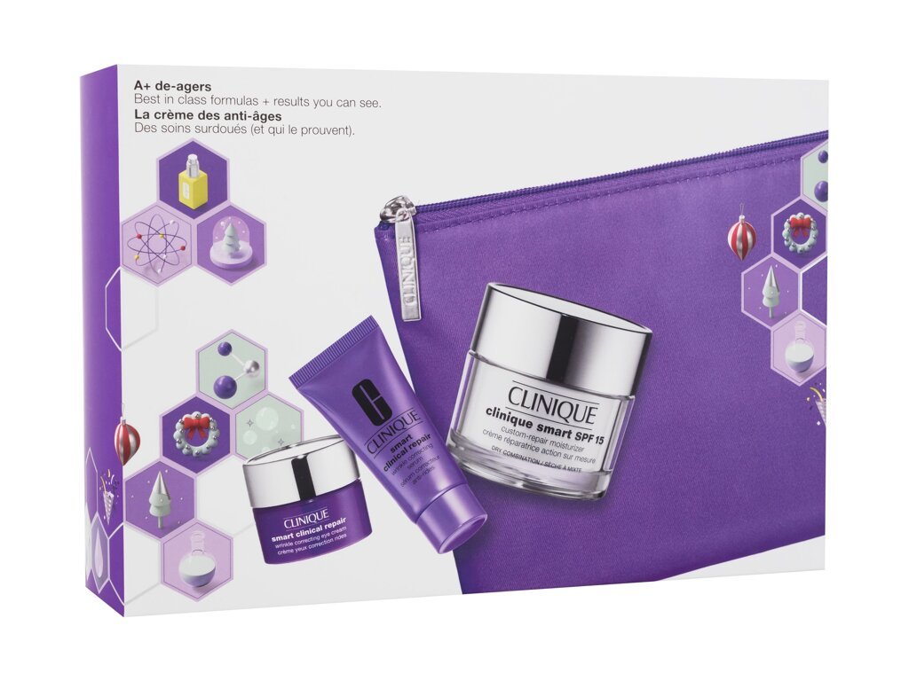 Sada obsahuje:Denní hydratační krém proti vráskám SPF 15 Clinique Smart (Custom-Repair Moisturizer) 50 mlProtivráskové pleťové sérum Smart Clinical Repair (Wrinkle Correcting Serum) 10 mlOční krém proti vráskám Smart Clinical Repair (Wrinkle Correcting Eye Cream) 5 mlKosmetická taštičkaPopis:Oční...