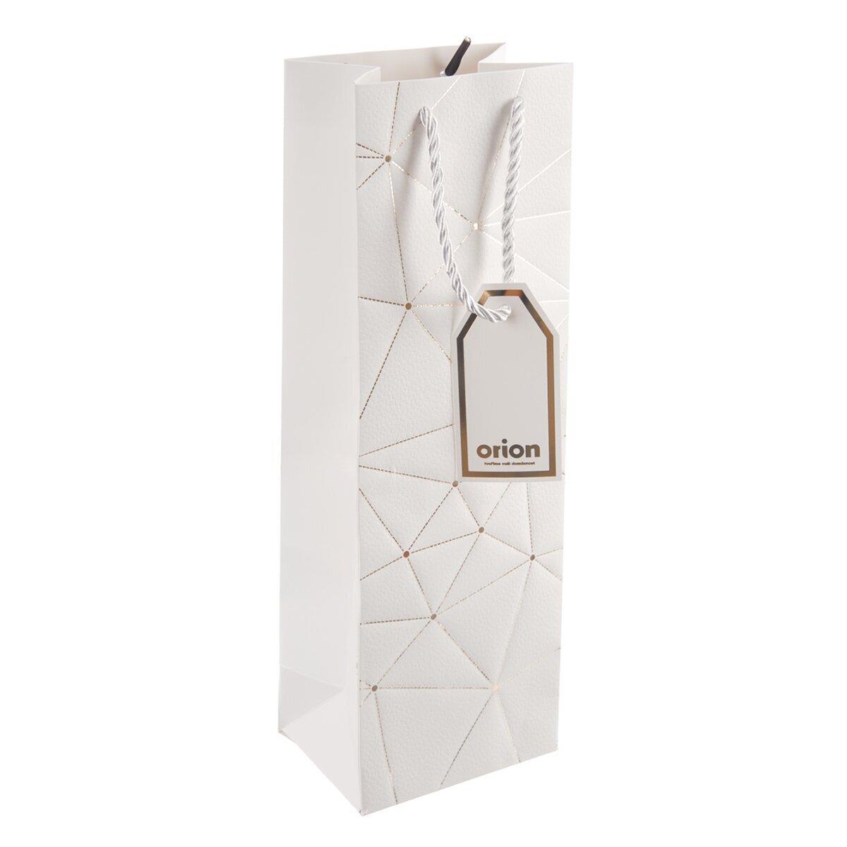 Dárková taška na láhev se dvěma uchy, plastický dekor, na přední straně zdobená zlatými linkami, doplněna jmenovkou. Bílá. Materiál: papír, provázek – polyester. Rozměry: 12x9x36 cm. prečítať celé
