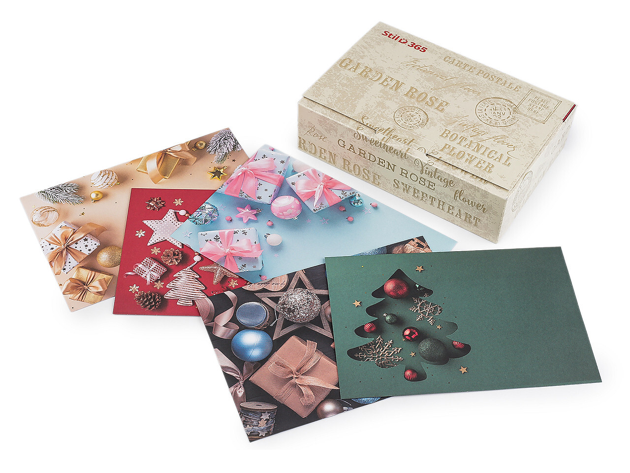 V originálním balení v krabičce najdete 5 motivů po 20 ks - celkem je tam tedy 100 ks obálek.