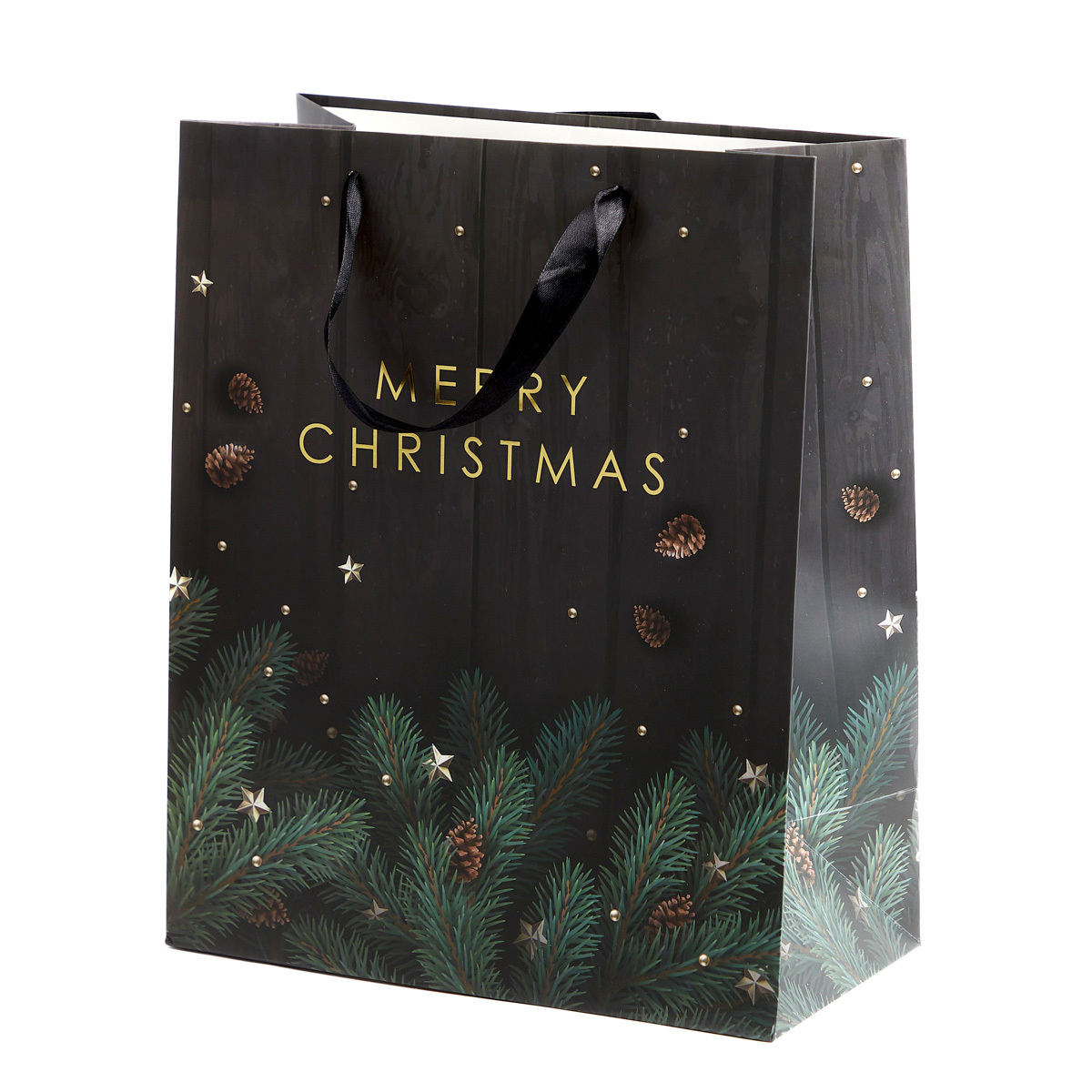 Odolná dárková taška - Krásný slavnostní design - Dárková taška v černém s nápisem Merry Christmas smallDárková taška CYMKA je krásný obal na vánoční dárek. Má slavnostní design zachovaný ve velmi elegantním stylu. Na černém pozadí jsou zelené větvičky vánočního stromku a šišky v hnědé barvě....