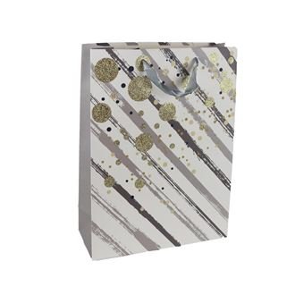 Dárková taška.Rozměry : 30 x 12 cm, výška 40 cm.Barva : kombinace bílá, šedá, zlatá.Materiál : papír. prečítať celé
