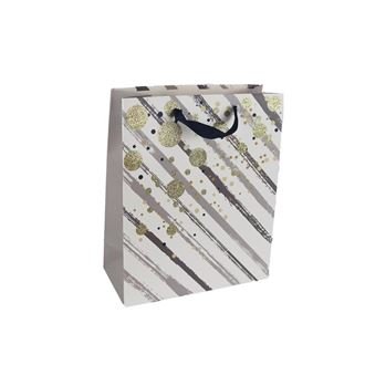 Dárková taška.Rozměry : 26 x 12 cm, výška 32 cm.Barva : kombinace bílá, zlatá, šedá.Materiál : papír. prečítať celé