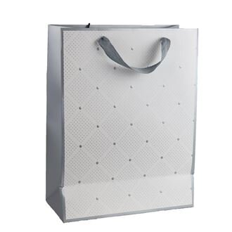 Dárková taška. Rozměry : 26 × 12 cm, výška 32 cm.Barva : stříbrná, bíláMateriál : papír. prečítať celé