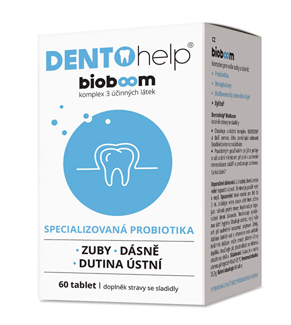 DentoHelp® bioboom je doplněk stravy se sladidly, který obsahuje probiotika, betaglukany a bioflavonoidy zeleného čaje v unikátním komplexu BIOBOOM® a dále cennou látku xylitol.