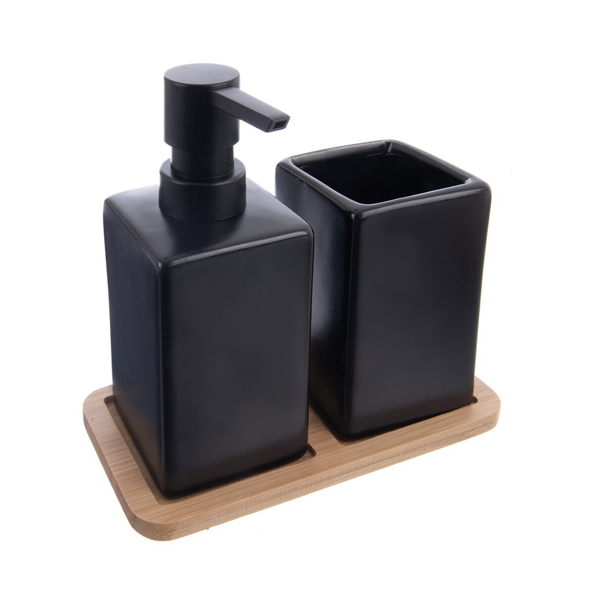 Koupelnová sada obsahuje černý dávkovač mýdla a pohárek na zubní kartáčky, obojí je uloženo na bambusovém tácku. Hodí se do každé koupelny i kuchyně a vypadá velmi elegantně. Materiál: dolomit, bambus, plat PP. Rozměry: celkové 17x8,5x16,5 cm, tácek 17x8,5x0,8 cm, dávkovač 6,5x6,5x16 cm, o. 0,3 l, pohárek na kartáčky 6,5x6,5x10,5 cm.