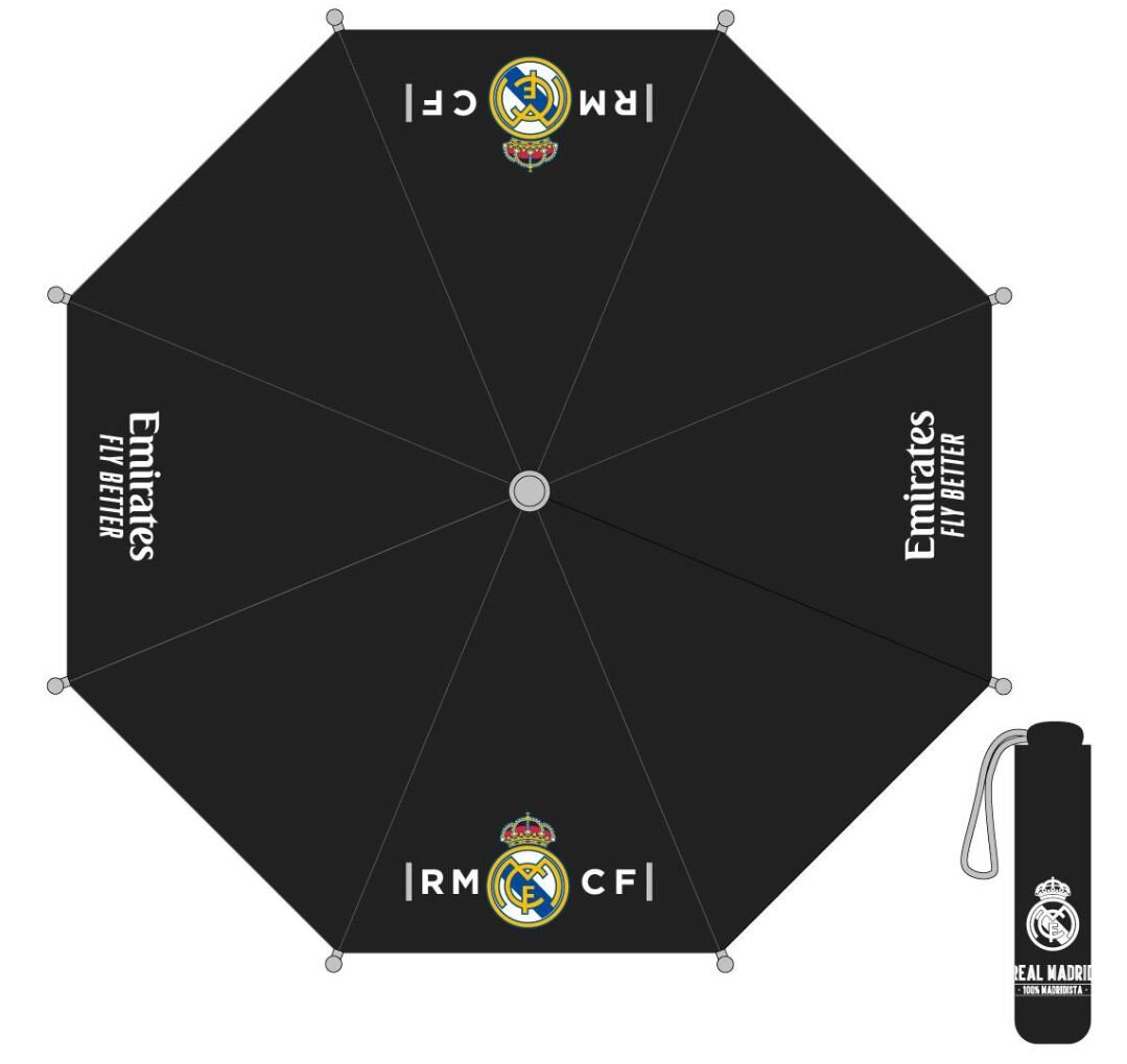 Oficiální produkt - skládací deštník a doplňkové zboží z katalogu výrobků s logem a grafikou populárního fotbalového týmu FC Real Madrid. Zboží je legálně licencováno a prodáváno se souhlasem vlastníků licenčních práv.Černý deštník s grafikou loga a nápisů fotbalového týmu Real Madrid FC! Deštník...