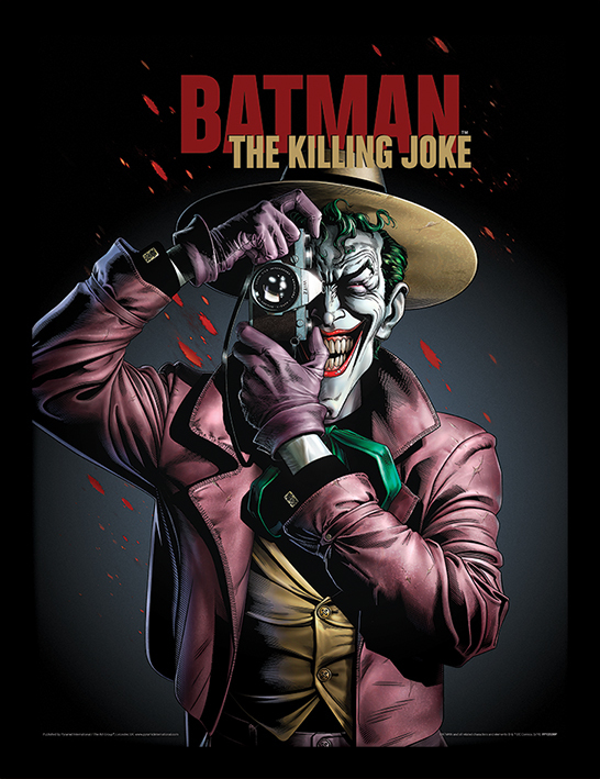 Plakát v černém rámu s fotografií komiksového superpadoucha jménem Joker a nápisem: Batman the killing Joke.
