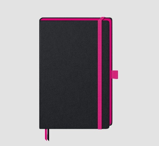 Elegantní poznámkový blok A5 Kompagnon s růžovou gumičkou, čtverečkovaný, ořízka bloku růžová, 176 číslovaných + 16 nečíslovaných stránek, 2 látkové záložky - jedna černá, druhá v barvě gumičky. 80g m2, 96 listů, formát 12,5 x 19,5 cm. prečítať celé