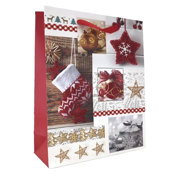 Dárková vánoční taška motiv dekorace s červenými třpytkami 25,5x31x10cm