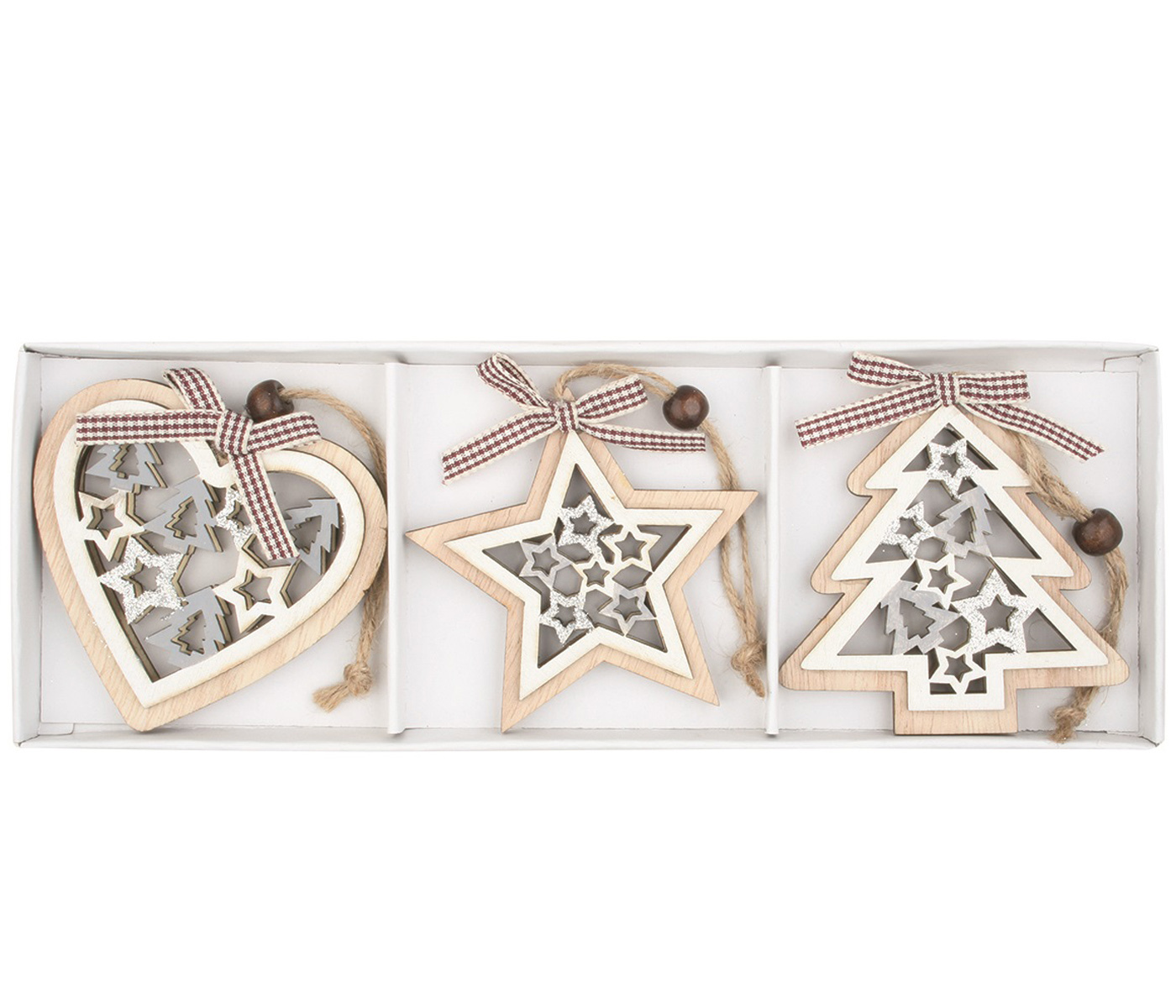 Dekorace vánoční - Ozdoba dřevěná 7,5 cm 3ks na zavěšení v sadě, 4867