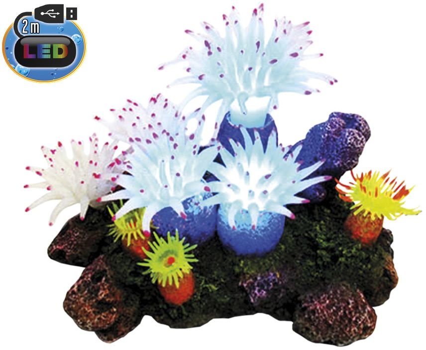 Dekorace do akvária značky Nobby. Aplysina s rostlinami na skále a s led osvětlením. USB kabel délky 2m. LED diody jsou umístěny uvnitř rostlin a mění barvy. Velikost 16,5 x 12 x 11 cm. Vyrobeno z polyresinu (syntetické pryskyřice) Velmi detailní provedení. Netoxické - neutrální na...