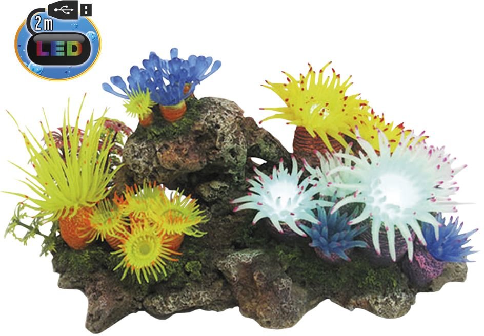 Dekorace do akvária značky Nobby. Aplysina s rostlinami na skále a s led osvětlením. USB kabel délky 2m. LED diody jsou umístěny uvnitř rostlin a mění barvy. Velikost 27,7 x 14,3 x 14 cm. Vyrobeno z polyresinu (syntetické pryskyřice) Velmi detailní provedení. Netoxické - neutrální na...