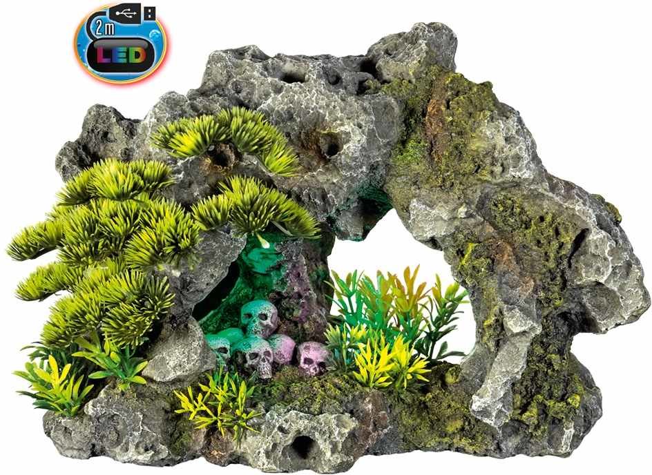 Dekorace do akvária značky Nobby. Skála s lebky a s LED osvětlením USB kabel délky 2m. Dekorace s LED diody. Velikost 30,2 x 18,5 x 20,8 cm Vyrobeno z polyresinu (syntetické pryskyřice) Velmi detailní provedení. Netoxické - neutrální na biologické rovnováhy. Vhodné pro sladkou vodu....