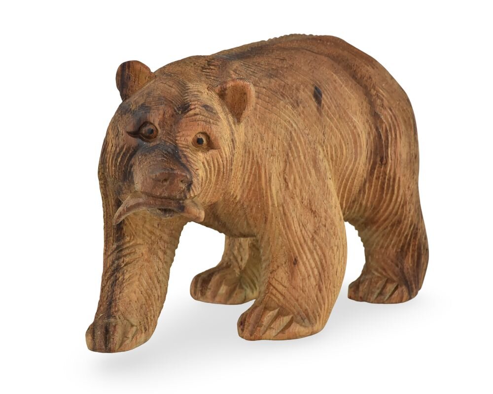Dřevěná soška Medvěd s rybou 11 cm - jednobarevný