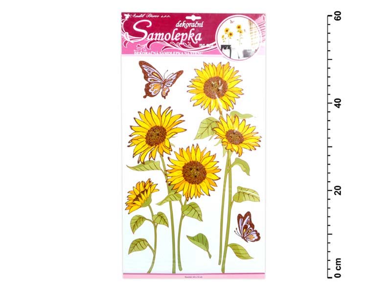 Samolepky na zeď slunečnice s motýly a glitry. Vhodné na stěny, okna, zrcadla, kachličky a jiné hladké plochy! NÁVOD: 1. Opatrně sejměte samolepku z podkladového papíru a umístěte ji na zvolenou suchou a čistou plochu. 2. Vyhlaďte od středu ke krajům.Uvedená cena je za 1 arch.
