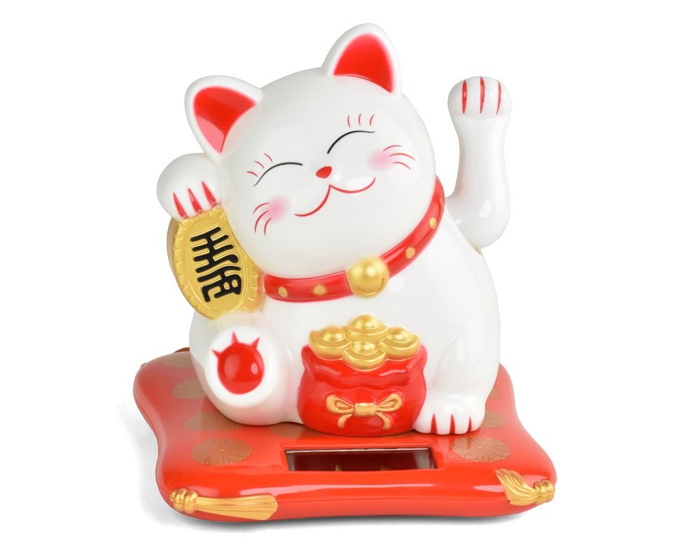 Mávající kočka štěstí se solárním napájením v bílé barvě. Rozměr: 9 x 10 x 10,5 cmKočka štěstí (japonsky Maneki Neko) je tradiční japonská soška, kterou můžete často najít před obchody, restauracemi a dalšími podniky, ale taky poblíž domů a bytů. Její zdvižená tlapka značí gesto pozvání. Sošky se...