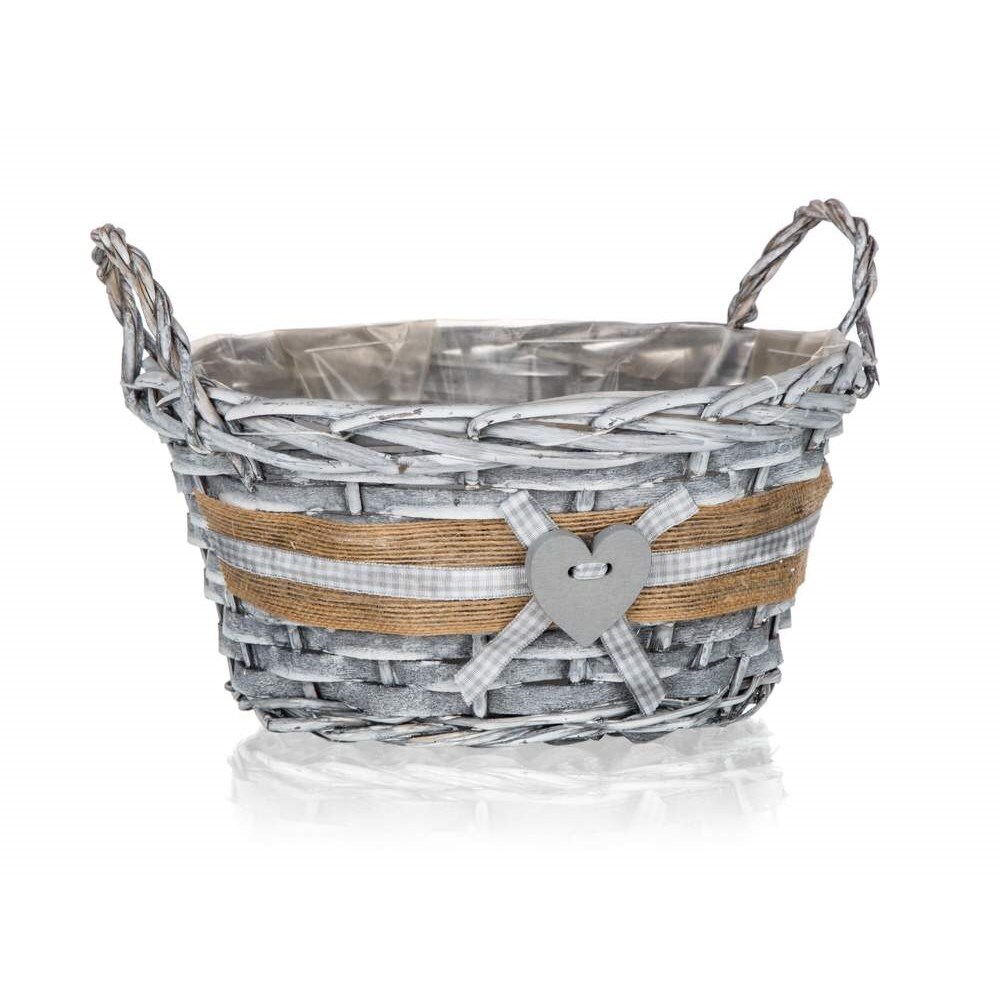 Košík proutěný s uchy o rozměru 25x12 cm je vhodný pouze pro dekorativní účely. Dodáván v šedé barvě kulatého tvaru s dekorem srdce, uvnitř igelit. prečítať celé