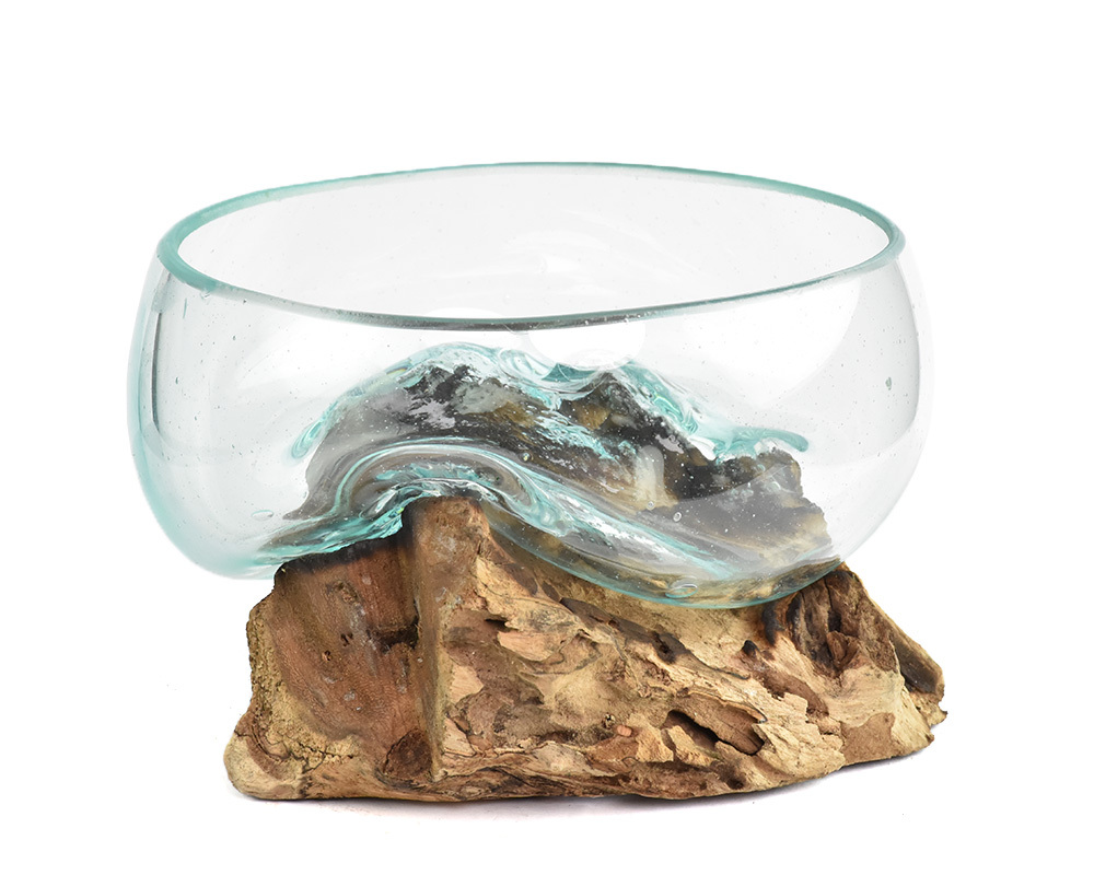Tato skleněná mísa spojuje tavené sklo a přírodní dřevo v praktický a estetický doplněk do interiéru. Sklo je ručně tvarované tak, aby přesně zapadlo na dřevěný podklad, což vytváří příjemný kontrast mezi chladným sklem a teplým dřevem. Každý kus je originální díky přirozené struktuře dřeva a...