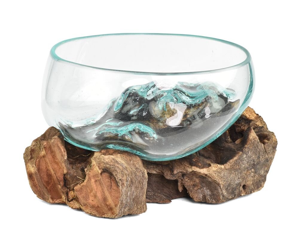 Tato skleněná mísa spojuje tavené sklo a přírodní dřevo v praktický a estetický doplněk do interiéru. Sklo je ručně tvarované tak, aby přesně zapadlo na dřevěný podklad, což vytváří příjemný kontrast mezi chladným sklem a teplým dřevem. Každý kus je originální díky přirozené struktuře dřeva a...