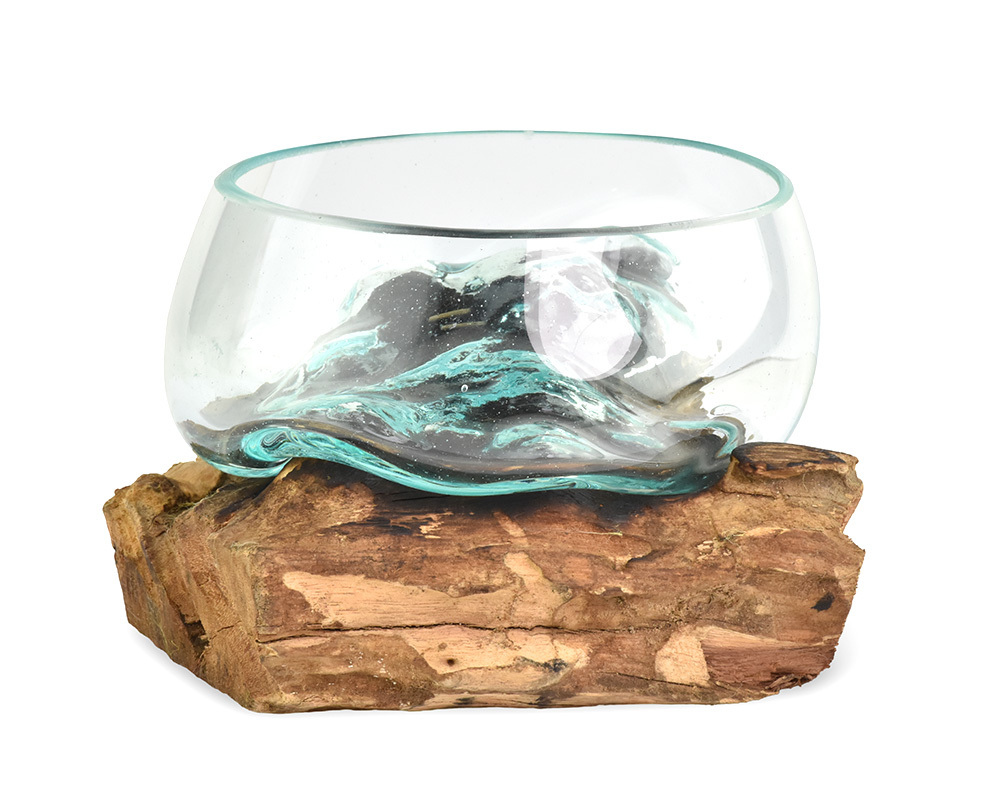 Tato skleněná mísa spojuje tavené sklo a přírodní dřevo v praktický a estetický doplněk do interiéru. Sklo je ručně tvarované tak, aby přesně zapadlo na dřevěný podklad, což vytváří příjemný kontrast mezi chladným sklem a teplým dřevem. Každý kus je originální díky přirozené struktuře dřeva a...