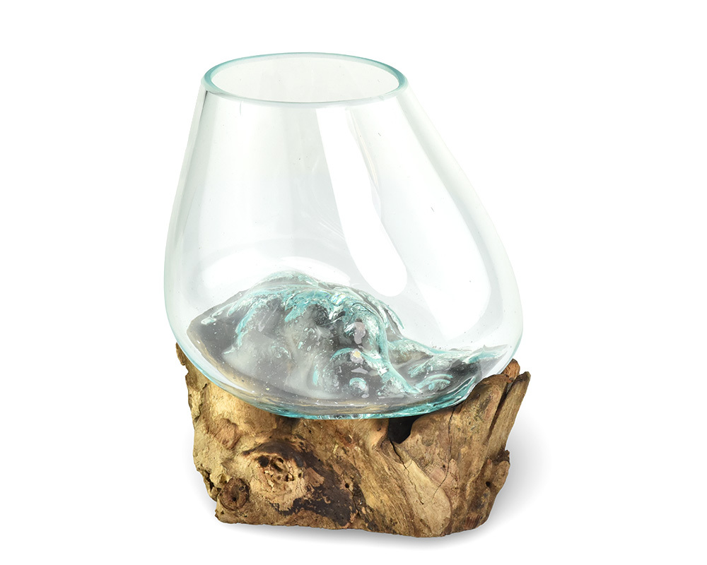 Tato skleněná nádoba spojuje tavené sklo a přírodní dřevo v praktický a estetický doplněk do interiéru. Sklo je ručně tvarované tak, aby přesně zapadlo na dřevěný podklad, což vytváří příjemný kontrast mezi chladným sklem a teplým dřevem. Každý kus je originální díky přirozené struktuře dřeva a...