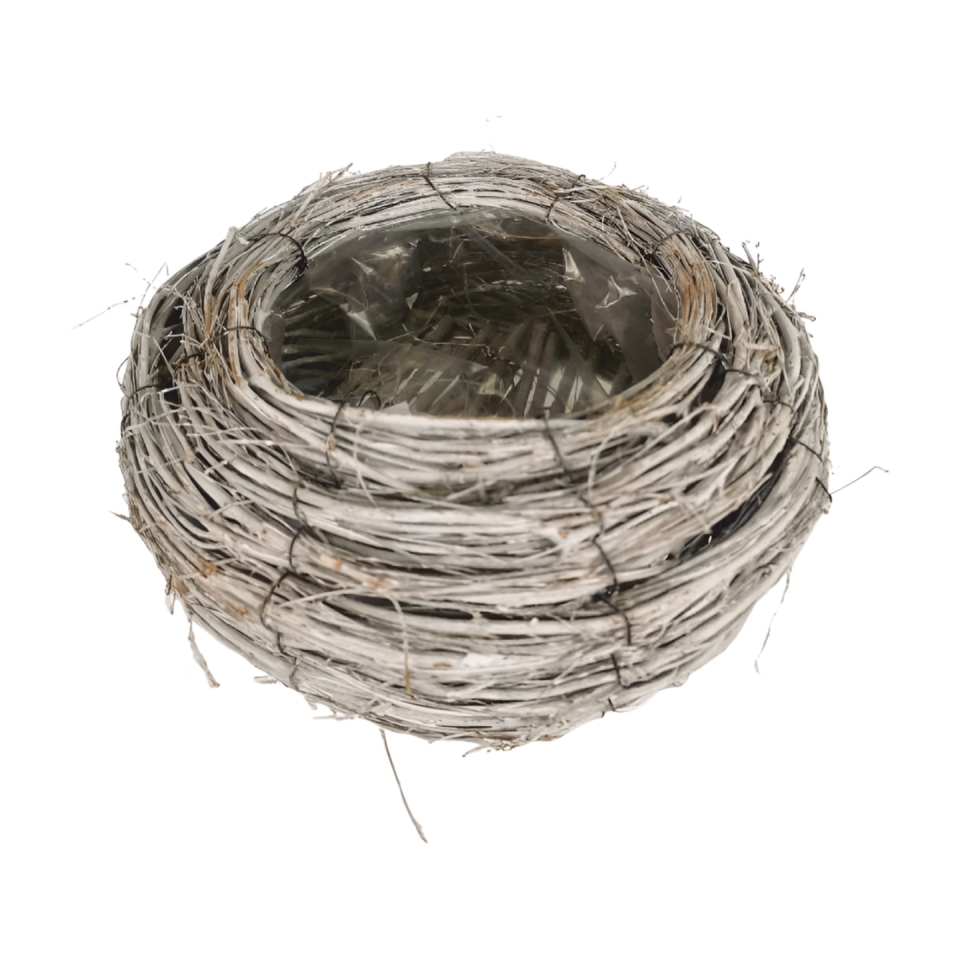 Proutěné šedobílé hnízdo na kovových nožičkách 29 x 16 cm výška: 16 cmvnější šíře 29 cmvnitřní průměr: 15,5 cmmateriál: proutí, kov, igelitbarva: šedobílávýstelka: igelitkošík/hnízdo stojí na kovových nožičkách prečítať celé