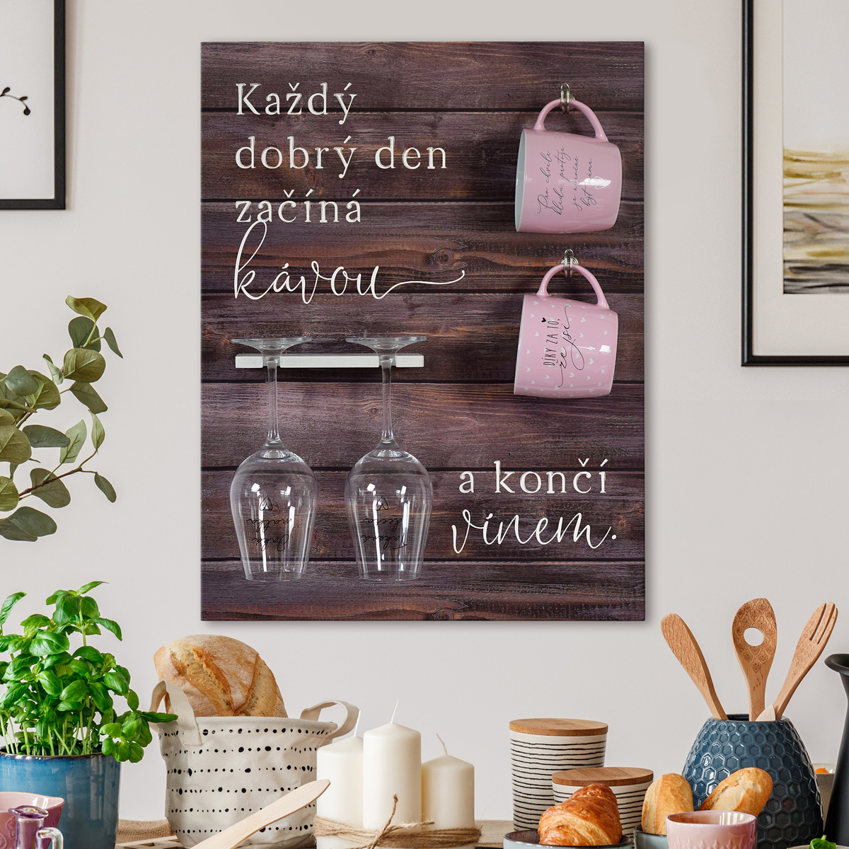 XXL cedule s držákem "Víno & káva" (tmavé dřevo) Ozdobte si svůj domov touto originální cedulí, který je zároveň i držákem na sklenice a hrníčky. Zpříjemněte si každý den vtipným citátem, který se vyjímá na této cedulce. Stačí už jen zavěsit hrníčky a sklenice a paráda je na světě! Skleničky a...