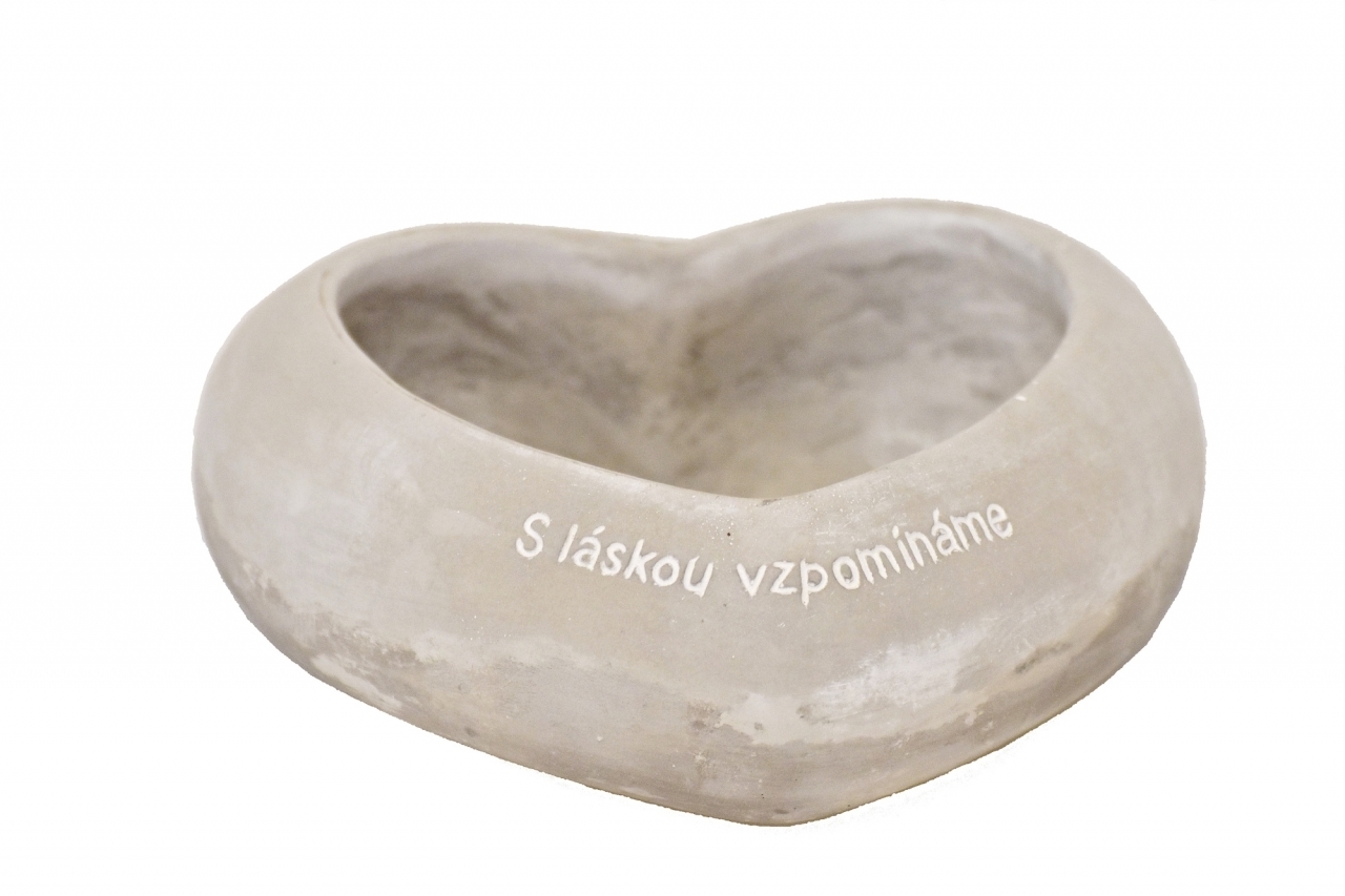 Dekorace z cementu s nápisem. Elegantní obal ve tvaru srdce na květiny, který mu dodává výjimečný vzhled. Betonové obaly jsou velmi populární, můžete je využít na živé, suché nebo i umělé květiny.