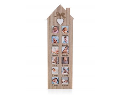 Tento originálny fotorámik má podobu vysokého domčeka s komínom, ktorý vďaka svojmu dizajnu nielen zaujme, ale aj krásne zapadne do detskej izby. Jeho konštrukcia ponúka celkom 12 malých rámsikov o rozmeroch 5x5 cm, kde môžete vystaviť fotografie vášho dieťaťa s označením veku od 1. až 6. mesiaca a od 1. až 6. roka. Vďaka tomu ľahko sledujete malé aj väčšie míľniky vo vývoji vášho dieťaťa.