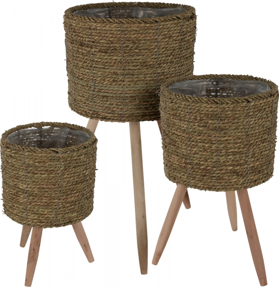 Sada 3 ks pletených květináčů na dřevěných nožičkách. Každý květináč je opatřen igeitovou výplní, bránící protečení vody.