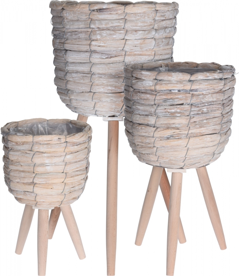 Sada 3 ks pletených květináčů na dřevěných nožičkách. Každý květináč je opatřen igeitovou výplní, bránící protečení vody.