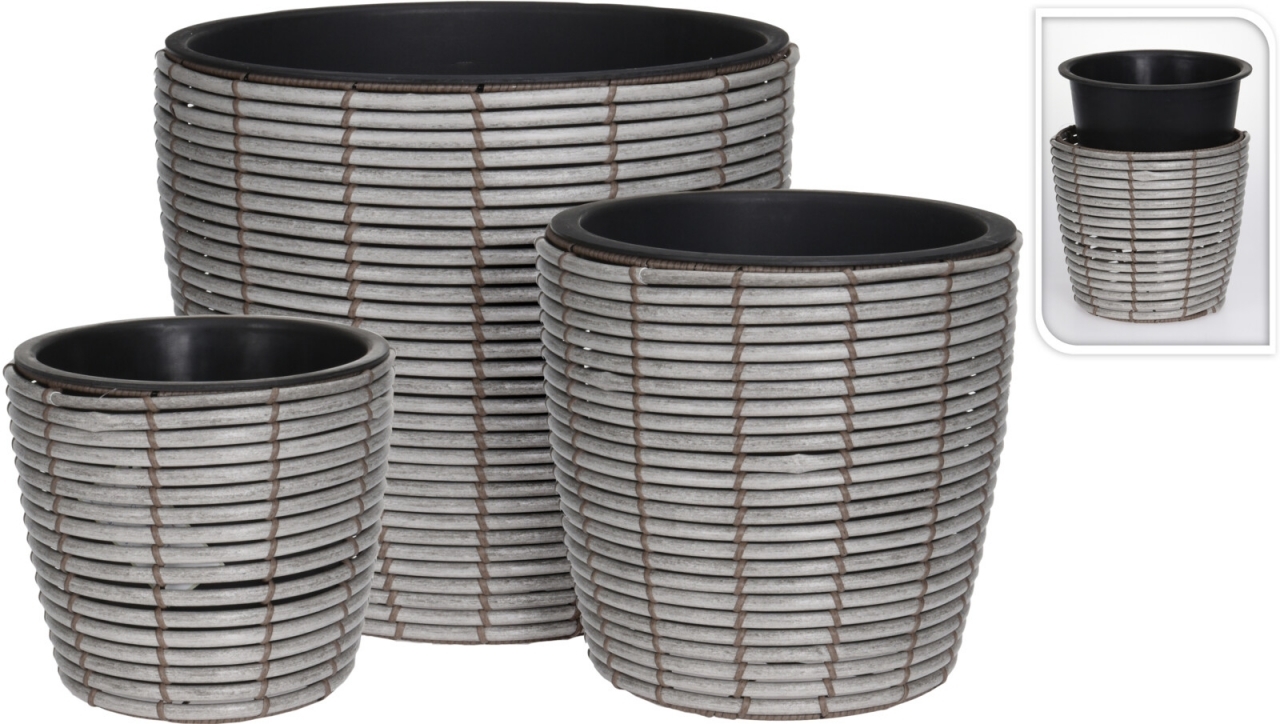 Moderní květináče z umělého ratanu s černým plastovým vkladem. V prodeji sada 2 ks. Klasický kulatý tvar květináče bude skvělým doplňkem každé zahrady, terasy i balkónu.