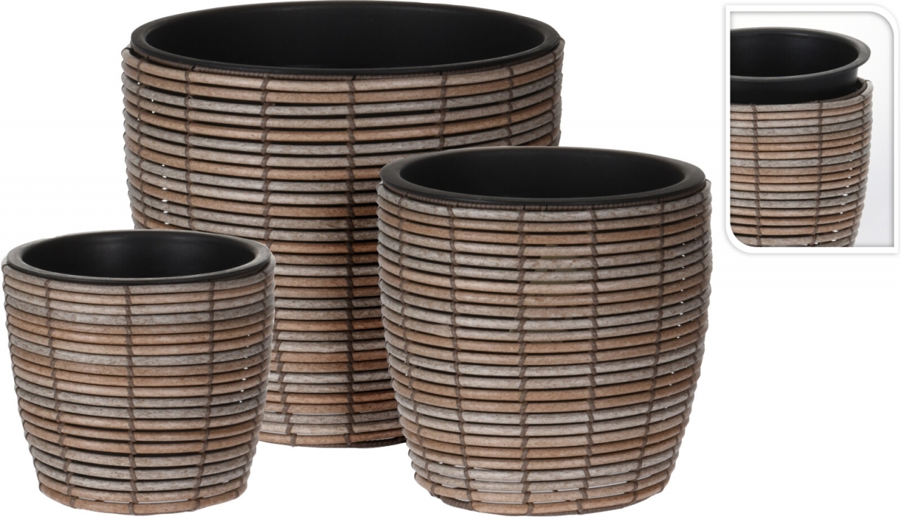 Moderní květináče z umělého ratanu s černým plastovým vkladem. V prodeji sada 3 ks. Klasický kulatý tvar květináče bude skvělým doplňkem každé zahrady, terasy i balkónu.