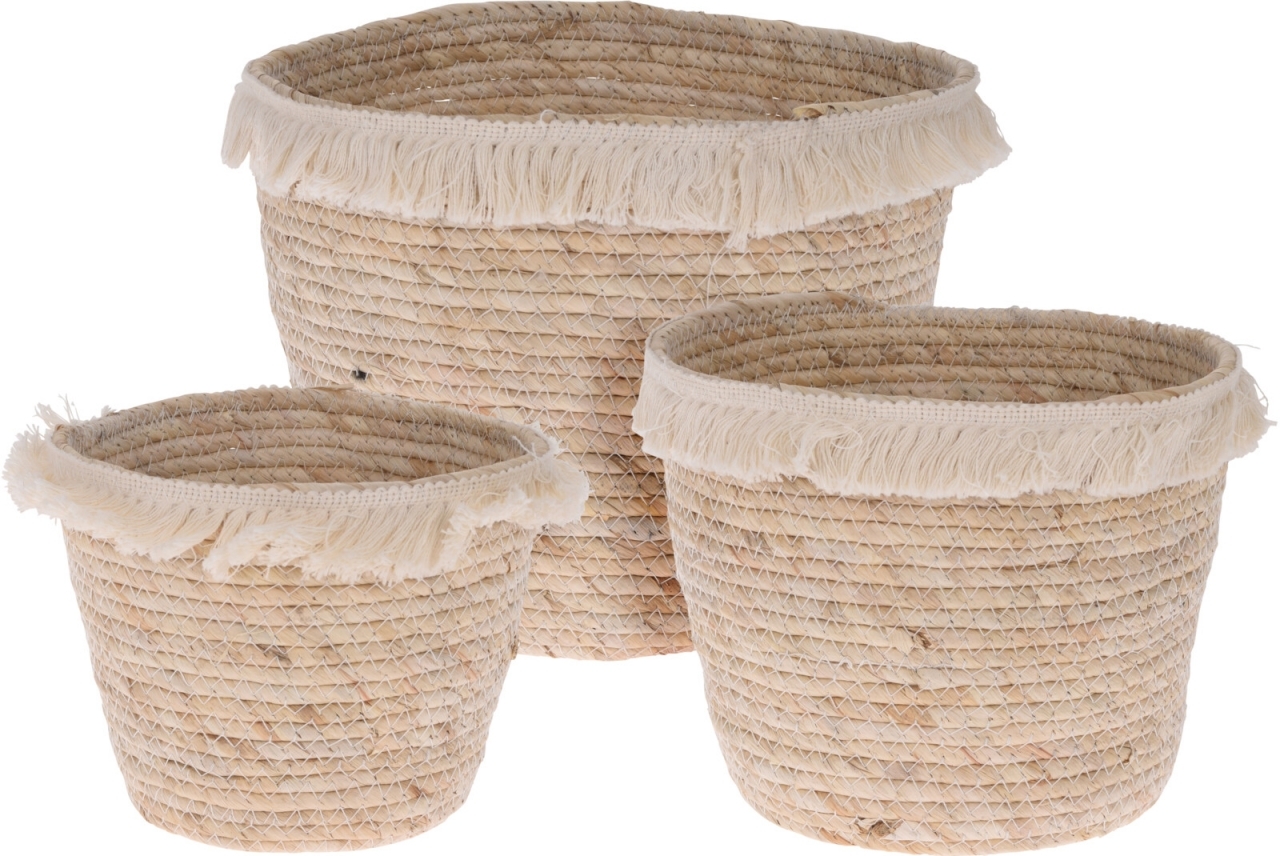 Sada 3 ks košíků vyrobených z kukuřičných provazů. Každý koš má po obvodu třásně.Materiál: kukuřičné listíRozměry:velký20x26cmstřední16,5x21 cmmalý13,5x19 cm prečítať celé