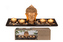 Černý dřevěný tác s Buddhovou hlavou, svíčkovými držáky a dekorativními kameny
