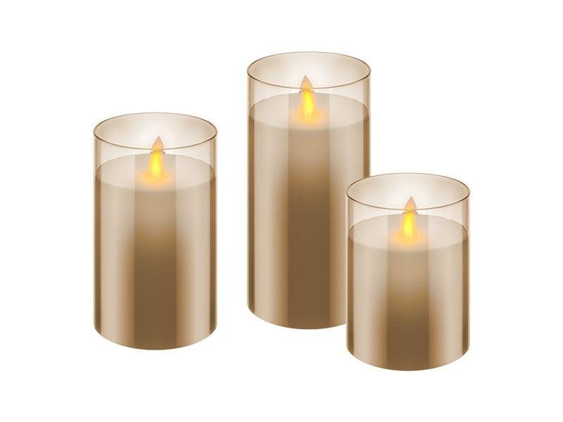 Sada 3 bílých LED svíček ve zlatém skle v různých velikostech (7,5 x 10 / 12,5 / 15 cm)- Jedinečný efekt plamene díky pohyblivému knotu a plášti svíčky z pravého vosku – těžko rozeznatelný od skutečných svíček- Elektrická svíčka s funkcí časovače – 6 hodin. v/18 hod. vypnuto,...