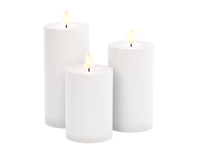 Táto sada obsahuje tri biele LED sviečky v rôznych veľkostiach, ktoré zaujmú svojím matným plastovým povrchom a realistickým čiernym knôtom. Vďaka svojim rozmerom (7,1 x 10 / 12,5 / 15 cm) sa ľahko hodia ako dekorácia na stôl, terasu alebo ako vianočná ozdoba. Teplé biele svetlo s teplotou 3000 K navodí príjemnú a útulnú atmosféru, ktorú oceníte pri rodinných stretnutiach, večierkoch alebo romantických chvíľach.