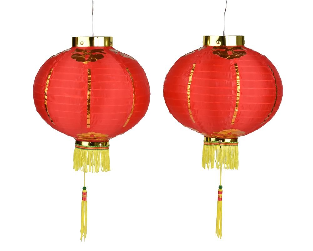 Dvojice tradičních čínských lampionů v červené barvě se zlatým dekorem a třásněmi.Parametry:Výška při zavěšení: 50 cmPrůměr: 25 cmMateriál: kov, látka prečítať celé