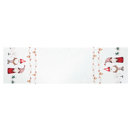Tento bílý běhoun s vánočním vzorem se skřítky na okrajích přináší do vašeho interiéru jedinečnou sváteční atmosféru. Vyrobený ze 100% polyesteru a s rozměry 40 x 150 cm, je ideálním doplňkem pro vánoční prostření stolu. Motiv se skřítky dodává této dekoraci punc radosti a zábavy, která perfektně doplní váš vánoční interiér. Užijte si svátky s touto krásnou dekorací, která zkrášlí váš prostor a vytvoří nezapomenutelnou atmosféru.