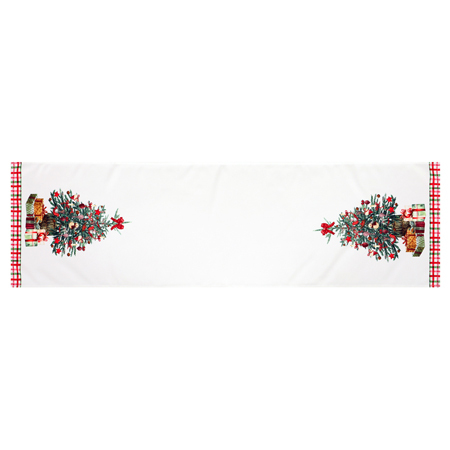 Tento běhoun bílé barvy s vánočním stromečkem na okrajích, přináší do vašeho interiéru jednoduchý, ale zároveň nádherný sváteční vzor. Vyrobený z 100% polyesteru a s rozměry 40 x 150 cm, je ideálním doplňkem pro vánoční prostření stolu. Barevně zdobený vánoční stromeček s dárky, přidává tomuto běhounu punc radosti a slavnostní atmosféry. Užijte si vánoční svátky s touto krásnou dekorací, která zkrášlí váš interiér a vytvoří nezapomenutelnou atmosféru.